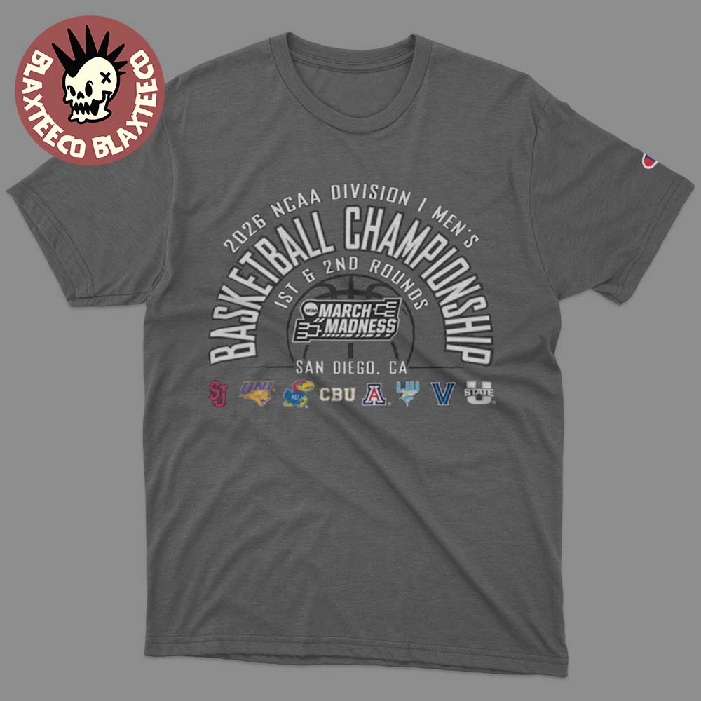 Celebrate the thrill of college basketball with the 2026 NCAA Division I Men's Basketball Championship March Madness San Diego California T-Shirt. This stylish and dynamic tee captures the excitement of the 1st and 2nd rounds held in vibrant San Diego, making it a perfect keepsake for fans of the tournament. Featuring bold, vintage-inspired graphics and official March Madness branding, the design highlights participating teams with colorful logos that stand out against the classic gray background. Made from premium-quality, breathable fabric, this shirt ensures maximum comfort whether you’re at the arena, watching from home, or out with friends.