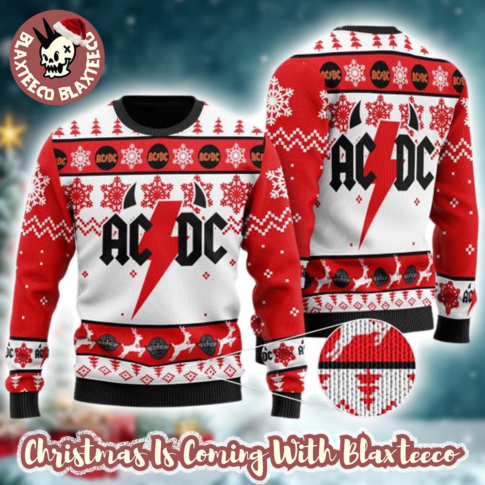 Blaxteeco: About ACDC Big Logo Thunder With Horns Holiday Pattern Red And White Ugly Christmas Sweater: