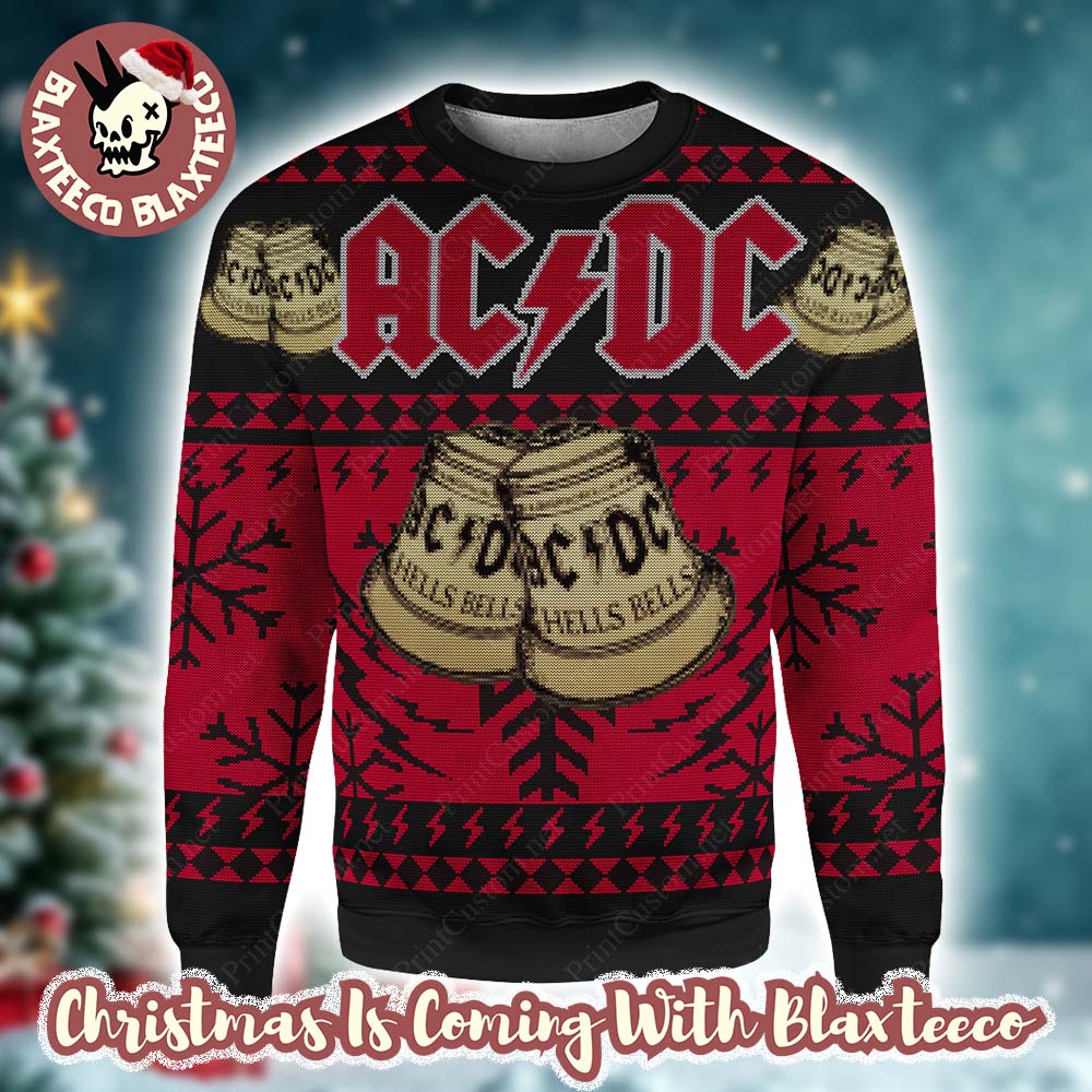 Blaxteeco: About ACDC Hells Bells Signature Bells Snowflakes Pattern Black And Red Vintage Ugly Christmas Sweater: