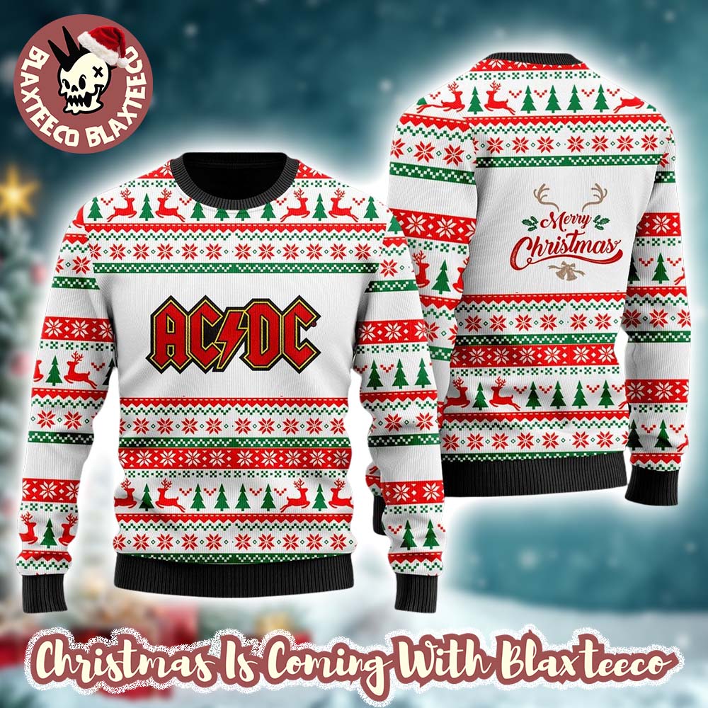 Blaxteeco: About ACDC Merry Christmas Signature Logo With Holiday Pattern Knitted White Ugly Christmas Sweater: