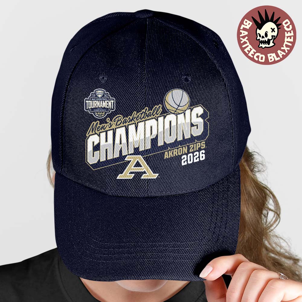The front of the cap features a bold embroidered “Men’s Basketball Champions – Akron Zips 2026” graphic alongside the Akron “A” logo and tournament emblem. The deep navy color combined with gold and white accents proudly represents the identity of the Akron Zips and highlights their championship achievement in the Mid-American Conference.