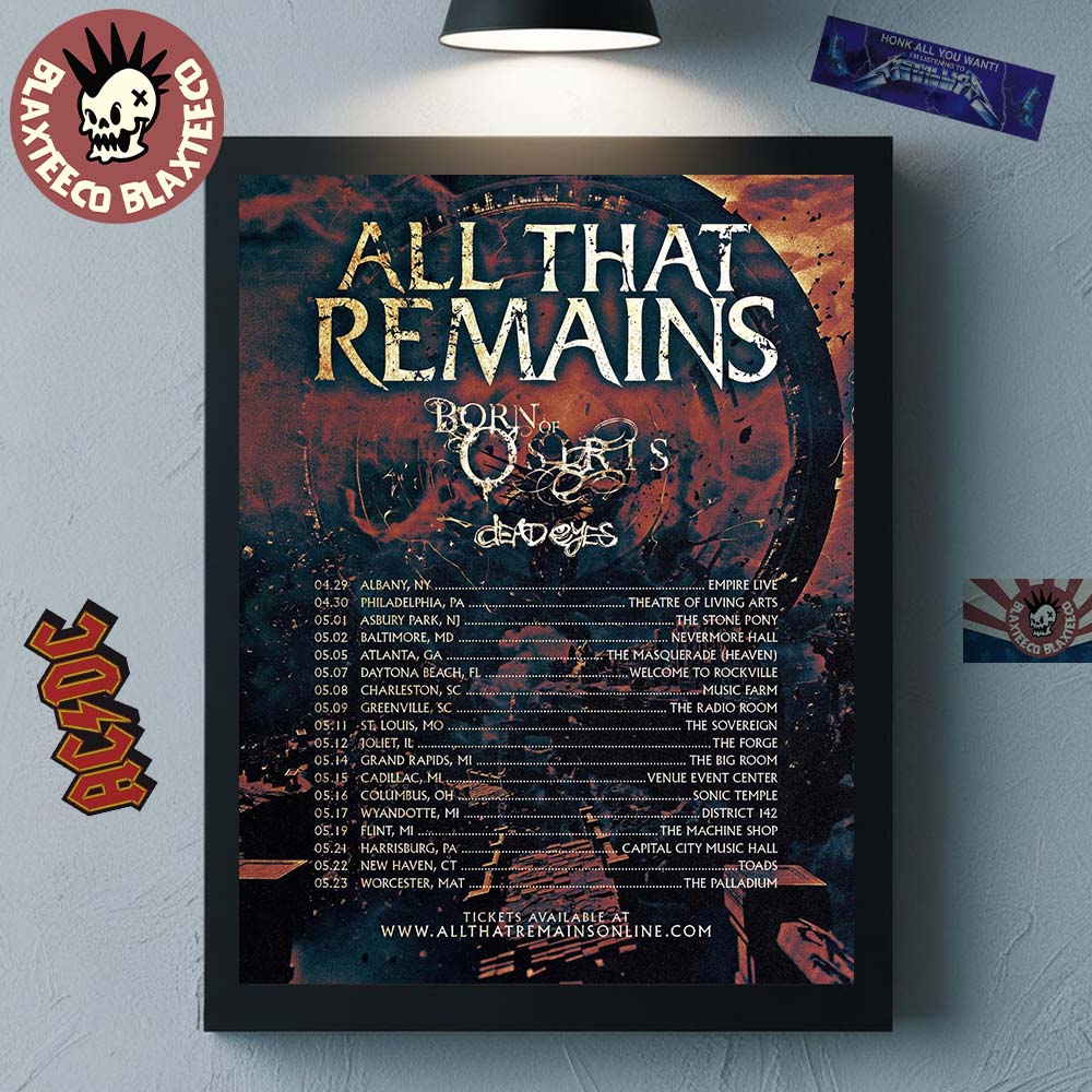 Bring the intensity of modern metal straight into your space with the All That Remains With Born Of Osiris And Dead Eyes North America Spring 2026 Tour City Dates Home Decor Poster Canvas. Designed around the official tour artwork, this poster captures the raw power and dark atmosphere of the Spring 2026 North American tour featuring All That Remains alongside Born Of Osiris and Dead Eyes. The bold typography, gritty textures, and dramatic color tones highlight the full list of tour dates and cities, making it both a striking piece of wall art and a meaningful keepsake for fans of metalcore and progressive metal. Perfect for music rooms, bedrooms, studios, or entertainment spaces, this canvas instantly showcases your passion for heavy music culture.