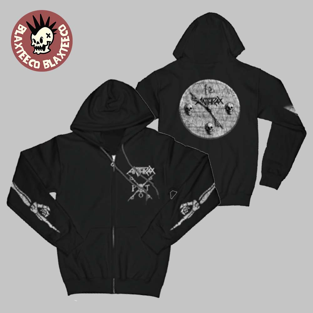 Stay warm while repping thrash metal legends with the Anthrax Japan 2026 Tour Merch Pot Zip Hoodie, a must-have for fans of Anthrax. This sleek black hoodie features a bold yet minimal front design with the iconic Anthrax logo and crossed graphic detail, delivering a clean but unmistakably heavy aesthetic. On the back, a striking circular graphic with skull elements adds a darker, more intense visual that perfectly captures the band’s signature edge. The sleeve prints complete the look, giving this hoodie a full-on tour merch vibe from every angle.