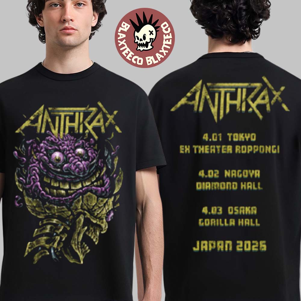 Unleash pure thrash energy with the Anthrax Japan 2026 Tour Merch Tee Brain Buster With Dates Back T-Shirt, a must-have for fans of Anthrax. This striking two-sided tee features a bold, chaotic creature graphic on the front—perfectly capturing the band’s aggressive sound and iconic metal aesthetic. The vivid artwork, with its intense colors and distorted design, gives off a raw, high-voltage vibe that stands out in any crowd. On the back, the shirt lists the official Japan tour dates for 2026, including Tokyo, Nagoya, and Osaka, making it a powerful keepsake from this explosive international run.