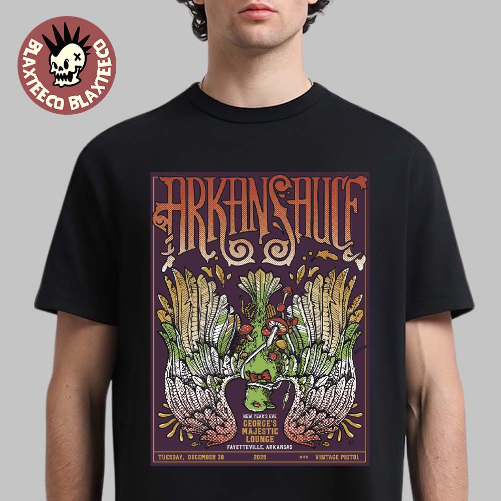 Arkansauce Fayetteville Arkansas 2025 Night 1 Event Poster At George's Majestic Lounge On December 30 2025 T-Shirt turns a standout concert poster into a wearable piece of art, celebrating a special New Year’s Eve run by Arkansauce at George’s Majestic Lounge. Printed on a black tee, the design features the full Night 1 poster artwork dated Tuesday, December 30, 2025, with rich purples, greens, and golds forming an intricate, psychedelic composition.