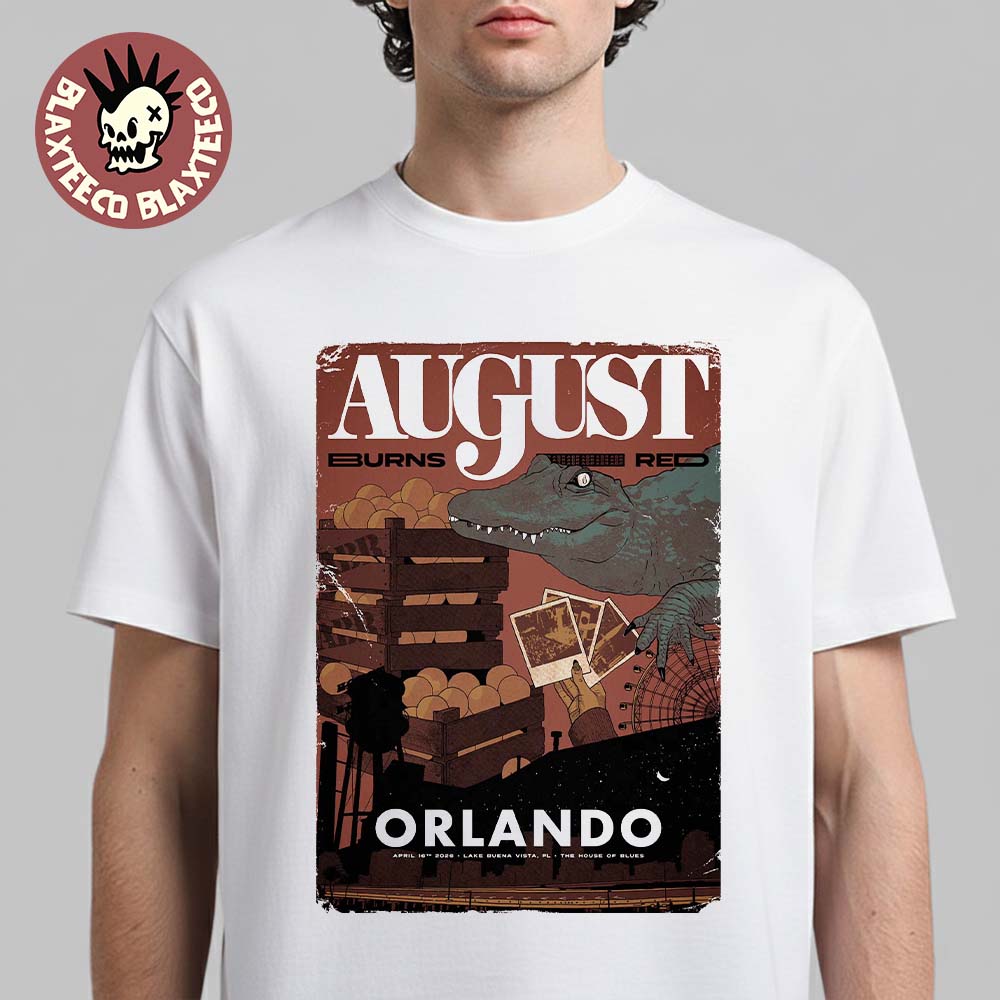 The August Burns Red Lake Buena Vista Florida 2026 Venue Poster At The House Of Blues On April 16 2026 T-Shirt is a must-have for fans who want to celebrate an unforgettable live music experience in style. Featuring a bold, vintage-inspired graphic, this design captures the essence of the Orlando show with rustic tones, distressed textures, and a unique illustrated scene that reflects the band’s powerful energy. The eye-catching artwork, including the stylized alligator and nostalgic concert poster layout, gives the shirt a distinctive Florida vibe while honoring the iconic House of Blues performance. It’s the perfect way to showcase your passion for August Burns Red and commemorate this special 2026 event.