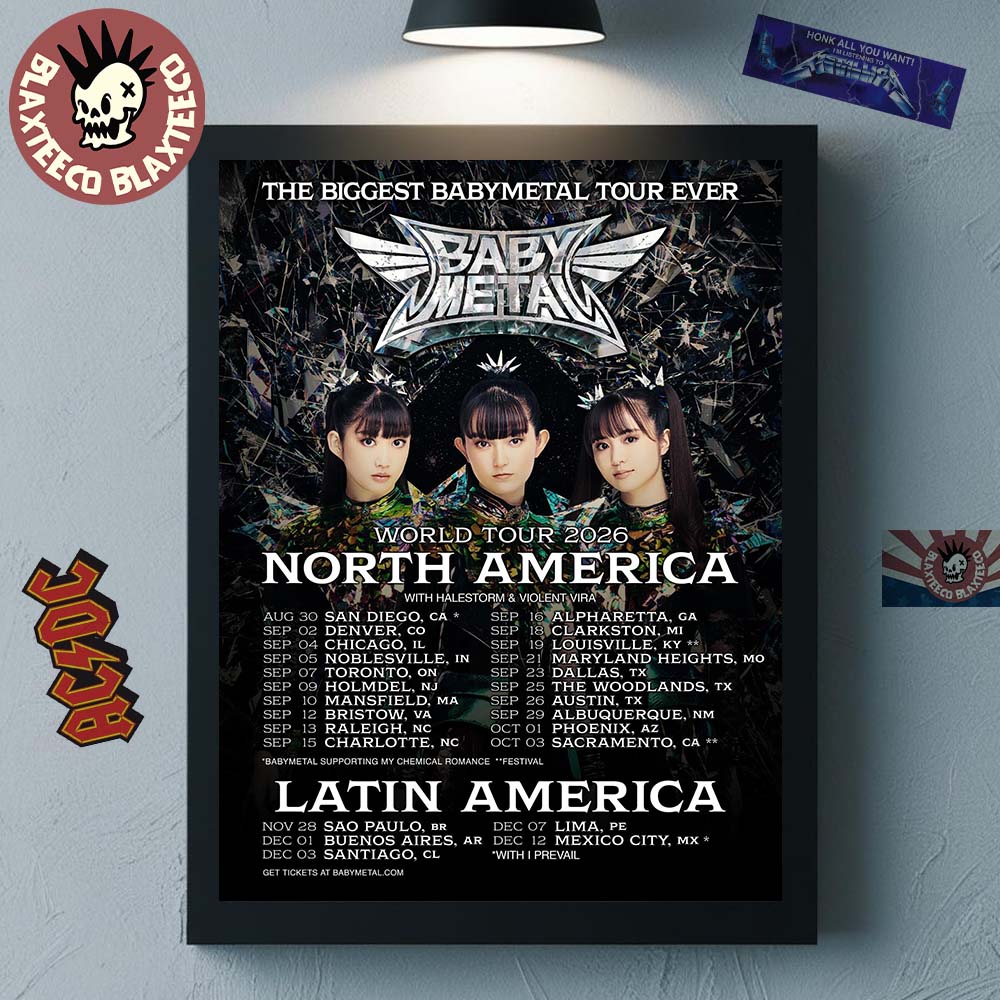 Celebrate one of the most electrifying global tours in metal history with the Babymetal World Tour 2026 North America And Latin America Schedule Dates The Biggest Babymetal Tour Ever Poster Canvas, a must-have collectible for fans of Babymetal. This stunning poster features bold, futuristic artwork of the band alongside the headline “The Biggest Babymetal Tour Ever,” capturing the energy and spectacle that define their performances. The detailed layout includes a full list of tour dates across North America and Latin America, making it both a visually striking piece and a meaningful keepsake for fans following the 2026 world tour.