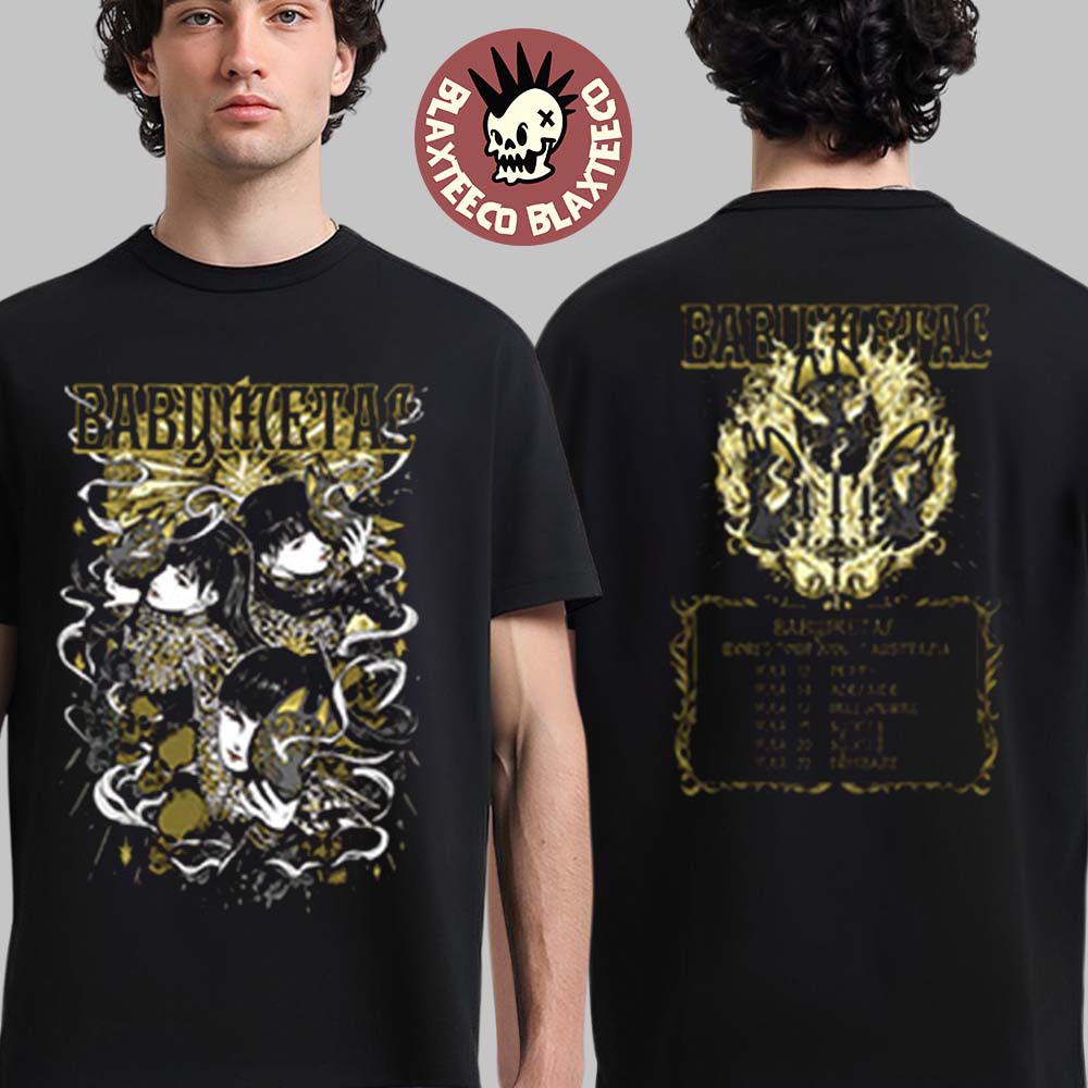 On the back of the shirt, a tour graphic lists stops for the Babymetal World Tour 2026 in Australia, framed by ornate golden artwork that gives the shirt a premium concert-merch feel. The dual-sided print creates a balanced design that showcases both the band’s identity and the commemorative tour details.