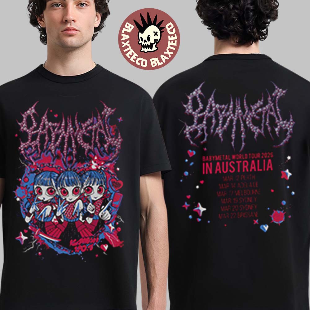 On the back of the shirt, the bold Babymetal logo appears above the “World Tour 2026 – In Australia” text, followed by a list of tour stops across Australia. This tour-date layout turns the shirt into a collectible souvenir for fans attending the shows or following the band’s international tour.