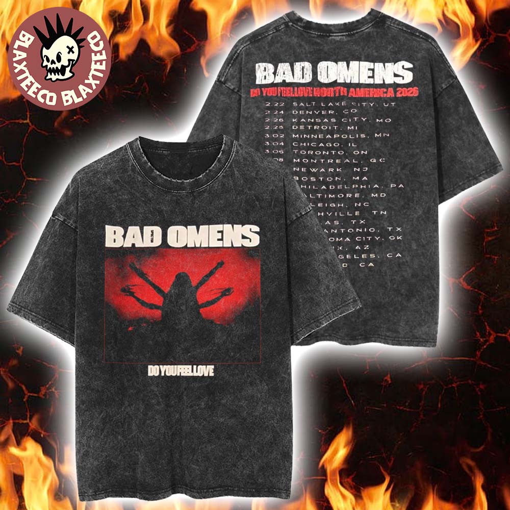 Blaxteeco: About Bad Omens Do You Feel Love North America Tour 2026 Merch With Dates Back Vintage Wash Tee: