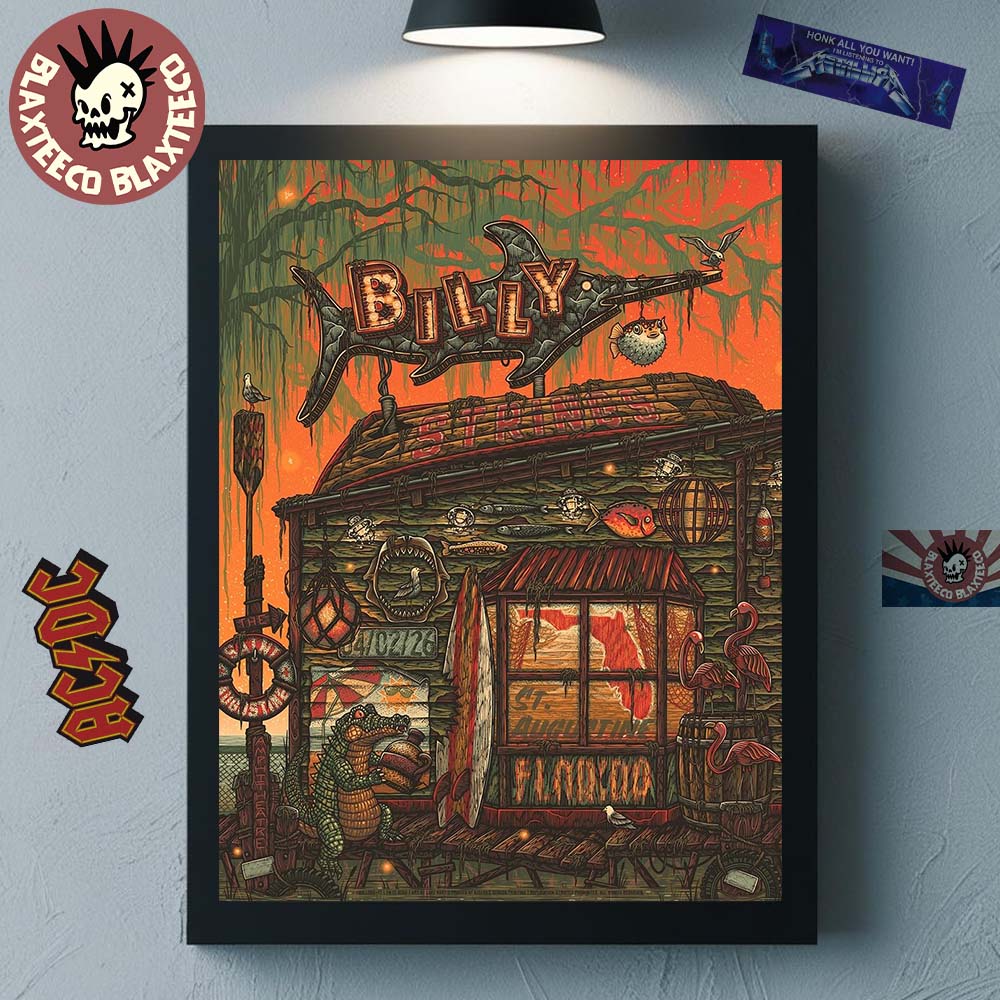 Add a bold, swampy Southern vibe to your space with the Billy Strings Spring St. Augustine Florida 2026 Night 1 Gig Poster At The St. Augustine Amphitheatre On April 2 2026 Poster Canvas. This richly detailed artwork captures the essence of Night 1 at the St. Augustine Amphitheatre on April 2, 2026, featuring a quirky, illustrated shack surrounded by coastal wildlife, vintage signage, and vibrant textures. From the alligator and flamingos to the rustic wood details and glowing orange sky, every element creates a storytelling scene that reflects the unique energy and atmosphere of a Billy Strings live performance.