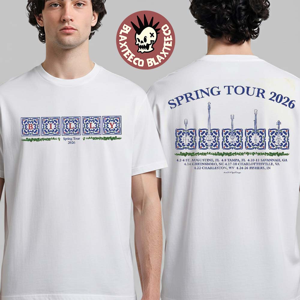 Celebrate the spirit of live bluegrass and unforgettable performances with the Billy Strings Spring Tour 2026 North America Merch Tee Spanish Tile Themed Two Sided T-Shirt, inspired by the artistry of Billy Strings. This unique tee features a charming Spanish tile–inspired design across the chest, spelling out “BILLY” in a colorful, vintage pattern that reflects both tradition and creativity. On the back, the bold “Spring Tour 2026” graphic is paired with detailed tour dates and locations, making it the perfect keepsake for fans who followed the journey across North America. The intricate guitar illustrations and decorative motifs give this shirt a distinctive, artistic flair that stands out from typical tour merch.