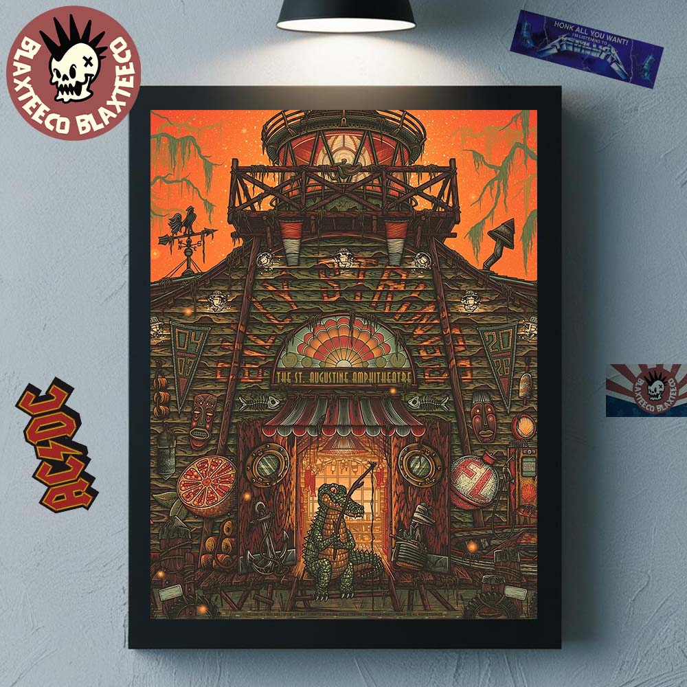 Bring the spirit of Night 2 to your walls with the Billy Strings St. Augustine Florida 2026 Night 2 Gig Poster At The St. Augustine Amphitheatre On April 3 2026 Poster Canvas. This richly illustrated artwork captures the April 3, 2026 show at the St. Augustine Amphitheatre with a mesmerizing, storybook-style scene. The design centers around a rustic, elevated structure glowing with warm light, surrounded by intricate coastal and swamp-inspired details—from carved masks and nautical elements to a banjo-playing alligator welcoming you inside. The vibrant orange sky and layered textures create a dynamic, immersive composition that perfectly reflects the energy and creativity of a Billy Strings performance.