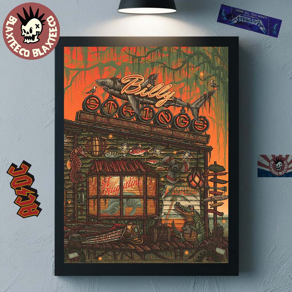 Complete the trilogy of unforgettable shows with the Billy Strings St. Augustine Florida 2026 Night 3 Gig Poster At The St. Augustine Amphitheatre On April 4 2026 Poster Canvas. This vibrant artwork captures the April 4, 2026 performance at the St. Augustine Amphitheatre with a richly detailed coastal scene full of character and charm. The design features a rustic seaside shack topped with a whimsical fish-shaped sign, surrounded by intricate elements like seahorses, nautical decor, and a curious alligator below. The glowing orange sky and layered textures create a warm, immersive atmosphere that perfectly reflects the energy and creativity of Billy Strings’ live performances.