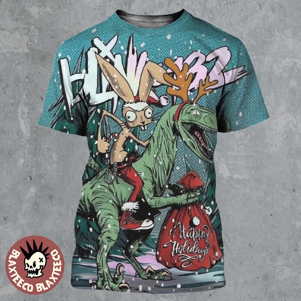 Blink 182 Happy Holidays 2025 Merry Xmas Rabbit Riding Velociraptor All Over Print Shirt Features: