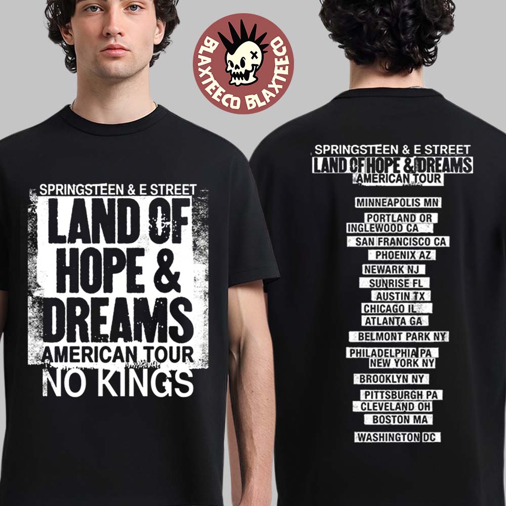 Celebrate legendary rock heritage with the Bruce Springsteen And E Street Land Of Hope And Dreams American Tour 2026 Merch No Kings Black T-Shirt, a must-have for devoted fans of Bruce Springsteen and the iconic E Street Band. This striking tee features a bold, distressed front graphic with the powerful “Land of Hope & Dreams” tour title and “No Kings” statement, capturing the spirit of freedom, unity, and classic American rock. The back design lists major tour stops across the United States, turning this shirt into a wearable piece of tour history.