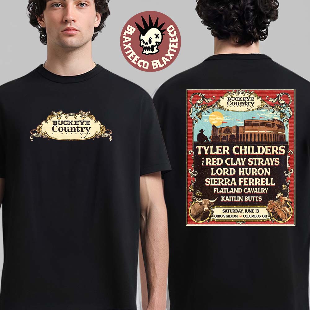 Buckeye Country Superfest 2026 Full Lineup In Columbus Ohio At Ohio Stadium On June 13 2026 Two Sided T-Shirt is a must-have piece of country music merchandise for fans attending one of the biggest live events of the year. Celebrating Buckeye Country Superfest 2026 at Ohio Stadium in Columbus, Ohio on June 13, 2026, this T-shirt features a clean front chest logo paired with a detailed vintage-style concert poster graphic on the back. The bold artwork highlights an incredible lineup including Tyler Childers, The Red Clay Strays, Lord Huron, Sierra Ferrell, Flatland Cavalry, and Kaitlin Butts, capturing the classic Americana spirit and festival energy that defines Buckeye Country Superfest.