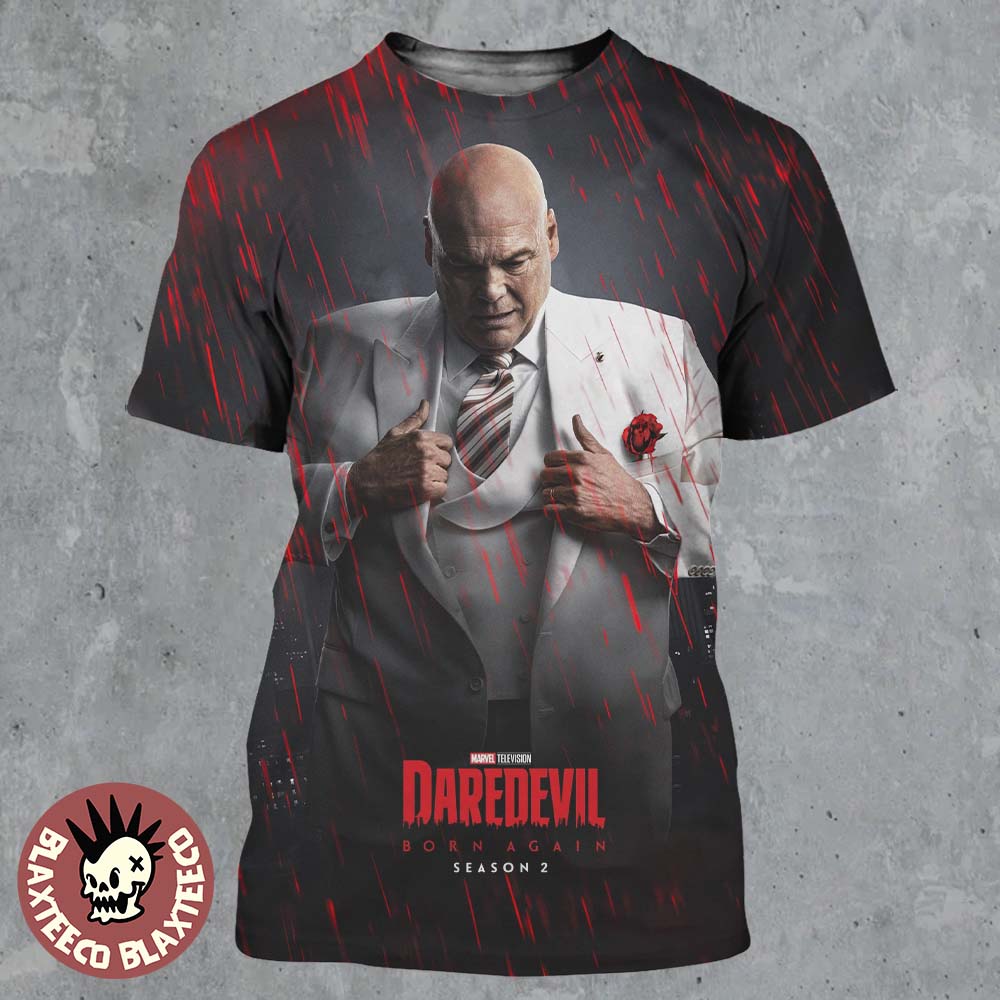 Make a powerful statement with the Daredevil Born Again Season 2 Kingpin Character Poster All Over Print Shirt, a striking piece of apparel inspired by the intense world of Daredevil: Born Again. Featuring a dramatic full-print design of the iconic villain Kingpin, this shirt captures the dark and gritty atmosphere that defines the series. The artwork shows Kingpin in his signature white suit under a storm of crimson rain, symbolizing power, danger, and the looming presence he holds over the city.