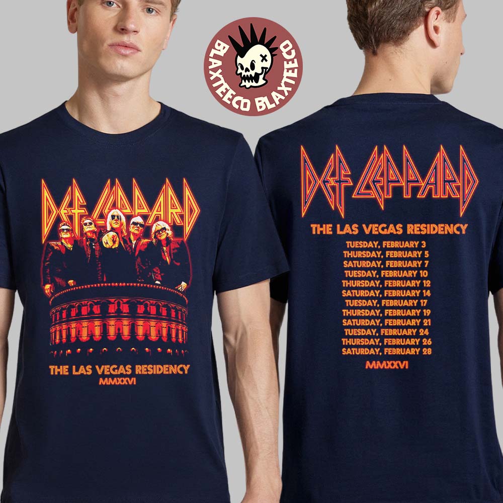 The Def Leppard Live At Caesars Palace The Las Vegas Residency 2026 Merch Photo Residency 2026 T-Shirt is a must-have piece of official-style merch for fans of the legendary rock band. Inspired by Def Leppard’s iconic Las Vegas residency at Caesars Palace, this t-shirt features a bold front graphic showcasing the band alongside a striking stage-inspired design. The classic Def Leppard logo stands out in vibrant colors, capturing the electrifying energy of a live performance in one of the world’s most famous venues. On the back, the shirt lists the full 2026 residency tour dates, making it a perfect collectible that commemorates an unforgettable rock experience.
