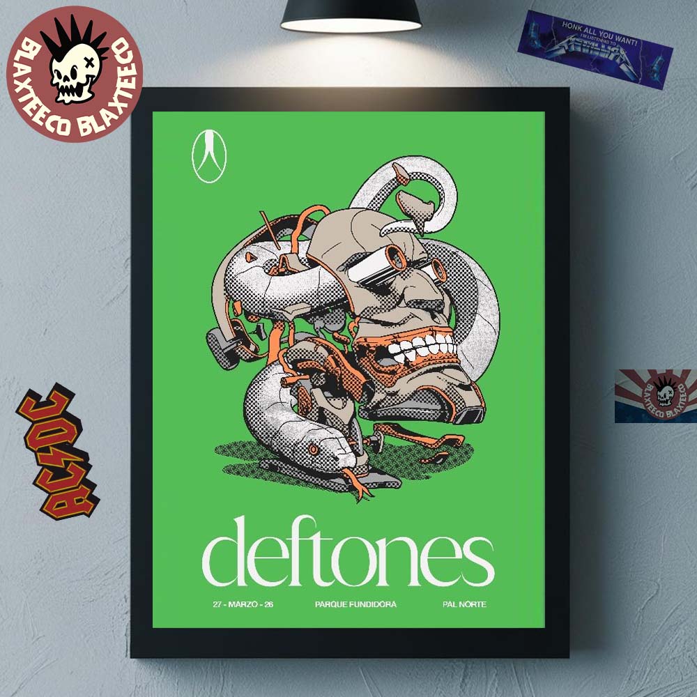The Deftones CDMX Mexico 2026 Venue Poster At Parque Fundidora Pal Norte On March 27 2026 Home Decor Poster Canvas is a striking piece of modern music-inspired wall art that perfectly captures the band’s experimental and artistic identity. Featuring a bold green background, the design showcases an abstract mechanical skull intertwined with surreal elements, creating a visually captivating composition that reflects Deftones’ unique sound and aesthetic. The minimalist “deftones” typography at the bottom adds a clean, contemporary touch, while the event details—CDMX, Parque Fundidora, and Pal Norte—highlight the significance of this exclusive 2026 performance.
