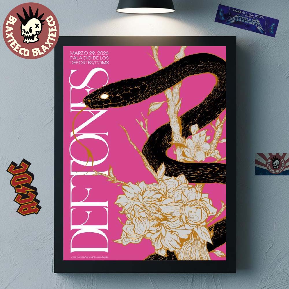 The Deftones CDMX Mexico City 2026 Venue Poster At Palacio De Los On March 29 2026 Home Decor Poster Canvas is a bold and artistic statement piece that perfectly reflects the band’s signature atmospheric style. Set against a vivid pink background, the design features a striking black serpent intertwined with delicate floral elements, creating a captivating contrast between darkness and elegance. The vertical “Deftones” typography adds a modern, minimalist touch, while the subtle event details—Mexico City, Palacio de los Deportes, and the March 29, 2026 date—highlight the significance of this unforgettable live performance.