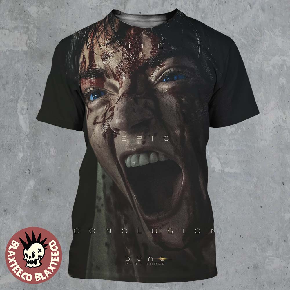 Turn intensity into style with the Dune 3 Anya Taylor-Joy is Alia Atreides Character Poster The Epic Conclusion All Over Print Shirt. This design goes all-in with a full-coverage, high-impact print of Alia in a raw, emotional moment—her piercing blue eyes and blood-streaked face capturing chaos, power, and inner conflict. The oversized artwork stretches across the entire shirt, creating a bold, immersive visual that feels like stepping straight into the film. The subtle “The Epic Conclusion” text blends into the design, maintaining a cinematic and polished finish.