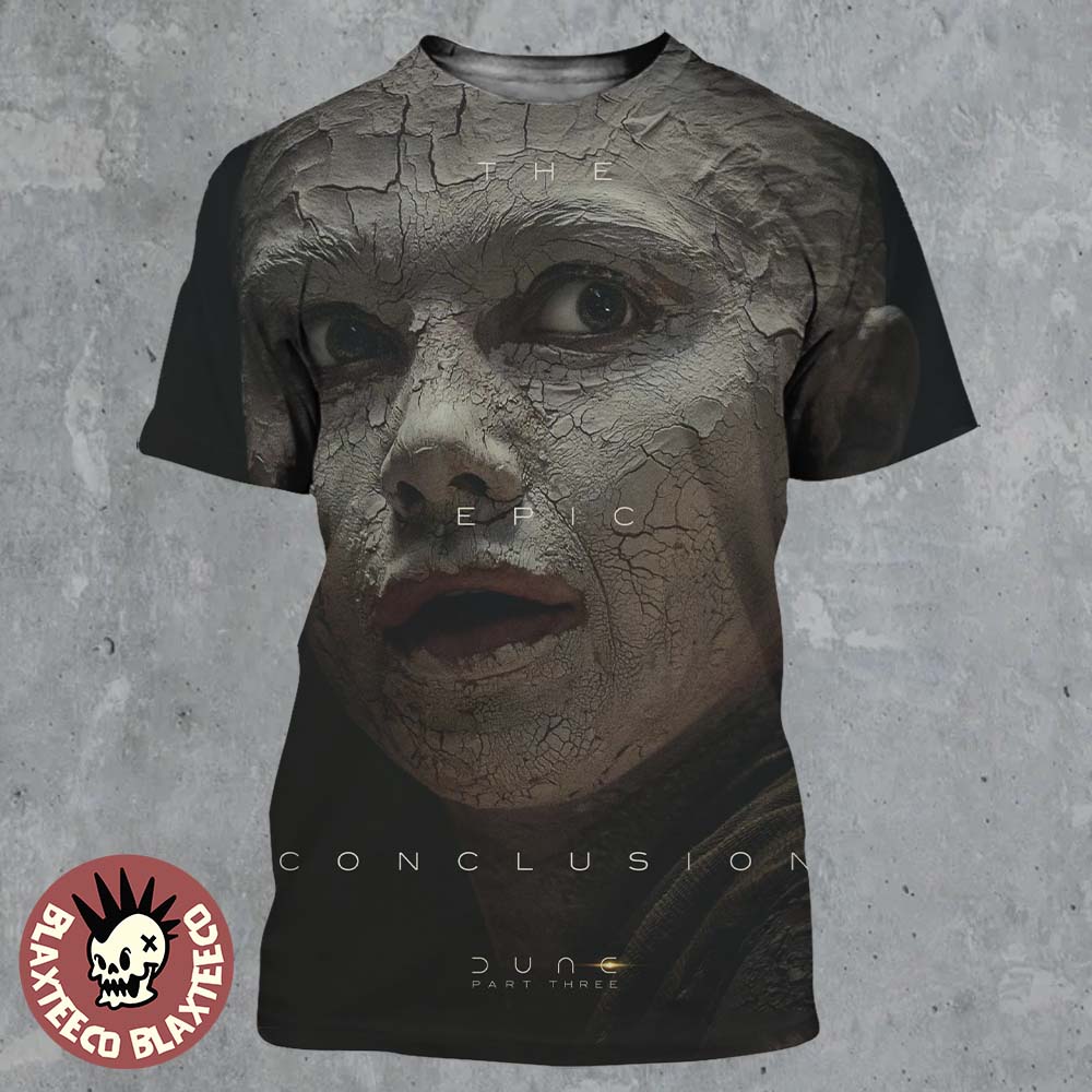 Step into the haunting elegance of the Imperium with the Dune 3 Florence Pugh Is Irulan Character Poster The Epic Conclusion All Over Print Shirt. This design fully immerses you in Irulan’s striking transformation, featuring a large-scale, edge-to-edge portrait with cracked, textured detail that gives her an almost statue-like, otherworldly presence. Her wide, expressive eyes add a sense of mystery and tension, while the subtle “The Epic Conclusion” text blends seamlessly into the cinematic composition.