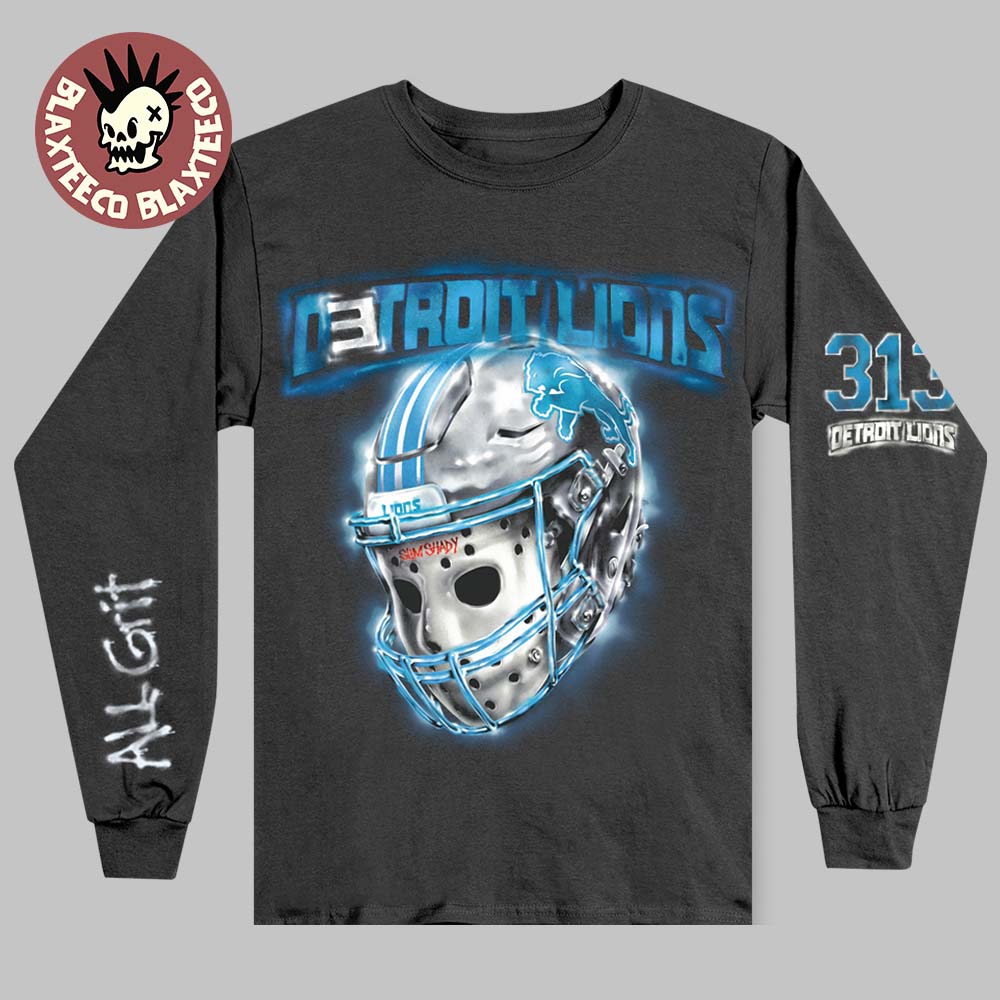 Show your Detroit pride in bold style with the Eminem x Detroit Lions Hockey Mask And Helmet All Grit 313 Longsleeve Tee. Crafted for fans who embrace the toughness, culture, and unbreakable spirit of the 313, this long-sleeve shirt blends gritty street-inspired artwork with the iconic energy of Detroit football. The front features a striking airbrushed-style design of a metallic helmet combined with a fierce hockey mask, glowing in electric blue tones that highlight the Detroit Lions identity. Soft, durable fabric ensures comfort and longevity, making this tee perfect for game days, concerts, or everyday streetwear.