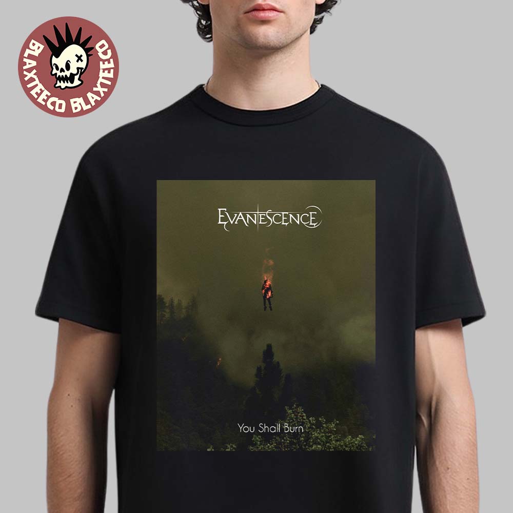 Evanescence You Shall Burn Cover Art T-Shirt is a powerful piece of alternative rock merchandise that captures the haunting atmosphere and emotional depth of Evanescence’s iconic visual style. Featuring the You Shall Burn cover art printed on a classic black T-shirt, this design showcases a dark forest scene with a solitary burning figure, symbolizing intensity, transformation, and inner strength. The minimalist layout and muted color palette reflect the band’s signature gothic aesthetic, making this shirt both visually striking and deeply expressive. It’s a perfect choice for fans who connect with Evanescence’s dark, cinematic storytelling and timeless alternative sound.