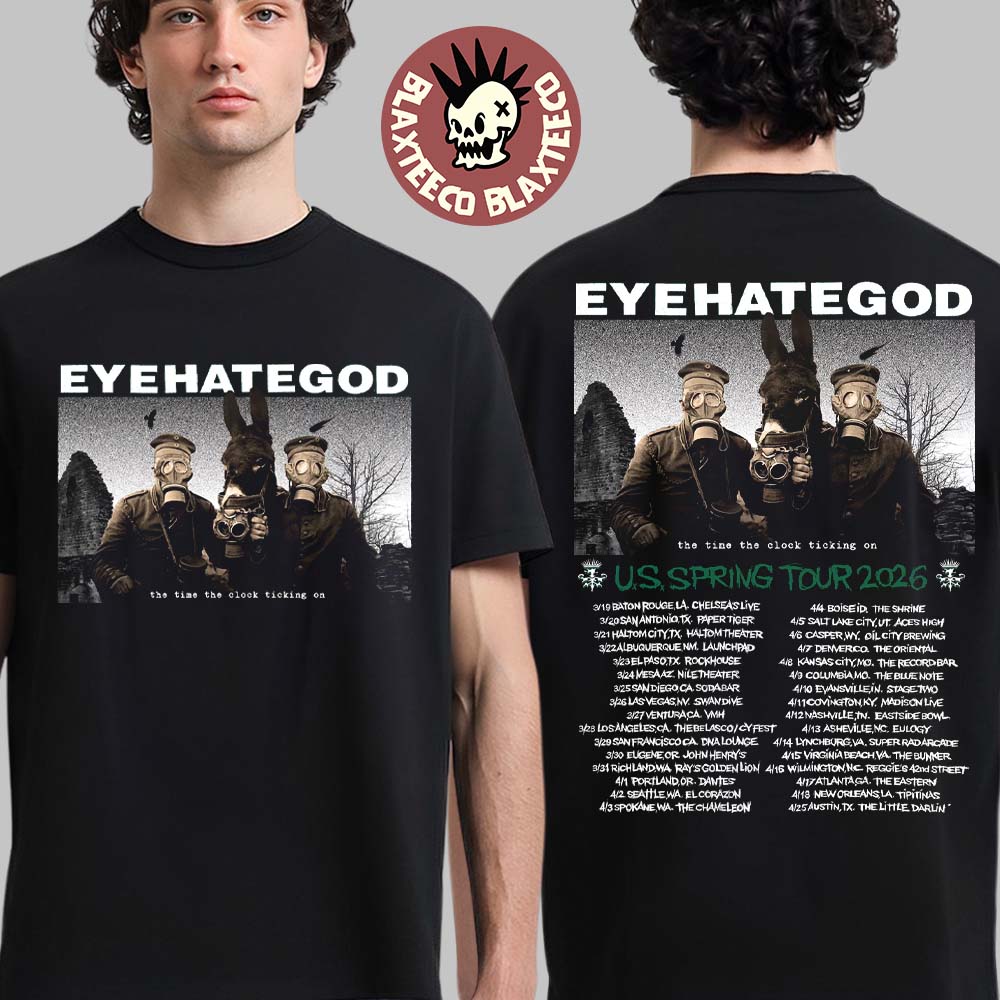 Dive into the raw, sludgy intensity of underground metal with the Eyehategod The Time The Clock Ticking On US Spring Tour 2026 Merch Schedule Dates Two Sided T-Shirt, a must-have for fans of heavy, uncompromising sound. This striking tee features a gritty front graphic showcasing haunting imagery of masked figures in a bleak, apocalyptic setting, perfectly capturing the dark aesthetic and sonic weight that defines Eyehategod. The bold band logo sits prominently above the artwork, while the eerie phrase “The Time The Clock Ticking On” adds an extra layer of intensity. Crafted from premium-quality materials, this shirt offers both comfort and durability, making it ideal for concerts, festivals, or everyday wear.
