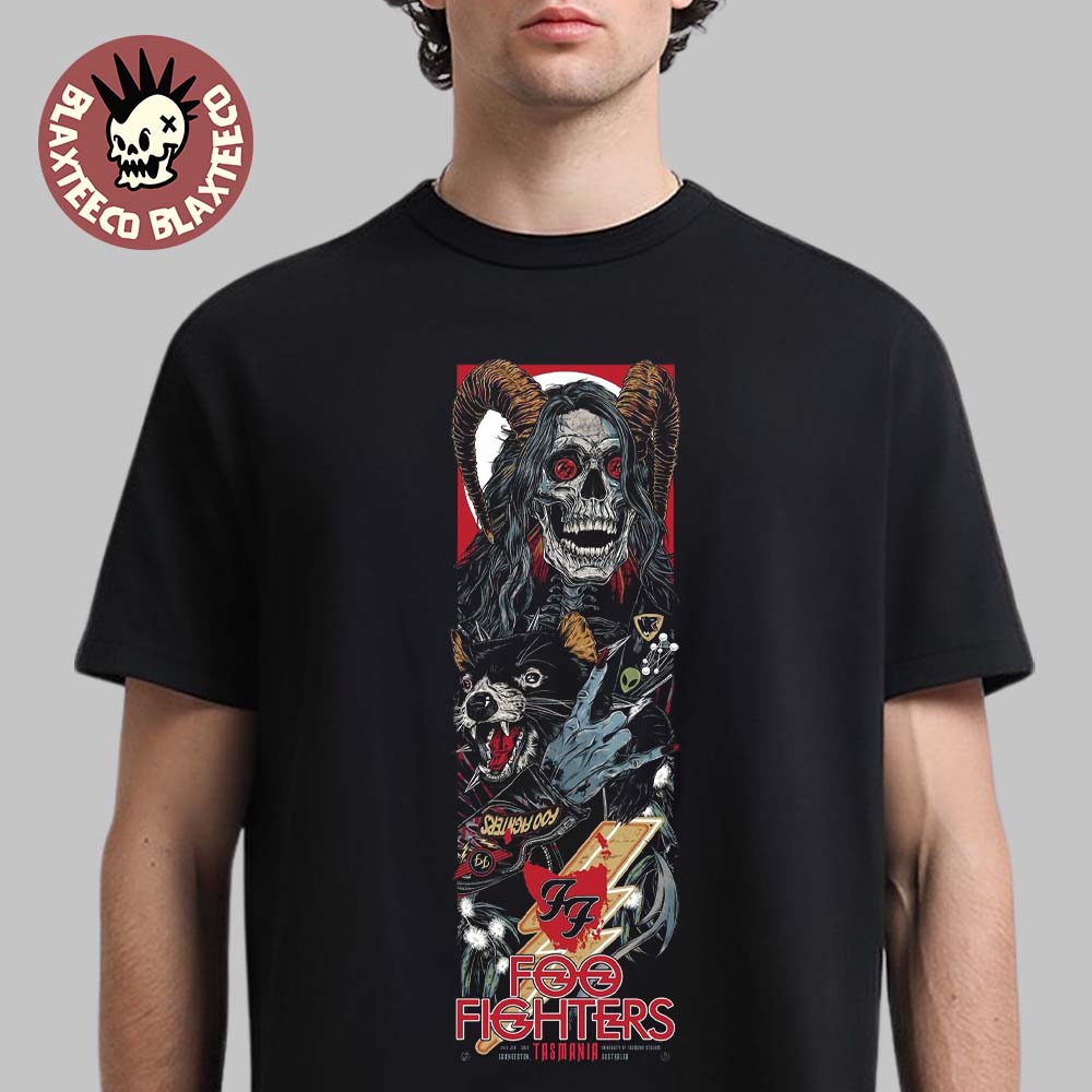 The front design showcases a powerful vertical illustration featuring a horned skull figure with piercing red eyes, layered with fierce rock imagery and the iconic Foo Fighters lightning bolt logo. Deep reds, bone tones, and gritty detailing pop dramatically against the black fabric, giving the shirt a dark, high-impact aesthetic straight out of a limited-edition tour poster. The “Foo Fighters – Tasmania” text anchors the artwork, marking the location and date as a permanent piece of tour history.