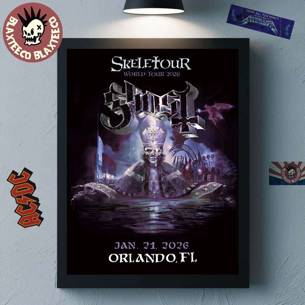 Elevate your space with dark, theatrical intensity using the Ghost Skeletour 2026 Orlando Florida Exclusive Art Decor Poster Canvas. This striking wall art showcases Ghost’s iconic Skeletour World Tour 2026 artwork, featuring a haunting central figure rising from shadowy waters beneath dramatic lighting and gothic architectural elements. The bold Ghost logo, atmospheric purples and blacks, and cinematic composition perfectly capture the band’s signature blend of occult imagery, heavy metal mystique, and theatrical storytelling. Designed to commemorate the Orlando, Florida show on January 21, 2026, this poster canvas is a must-have for fans who appreciate powerful visual art inspired by unforgettable live performances.