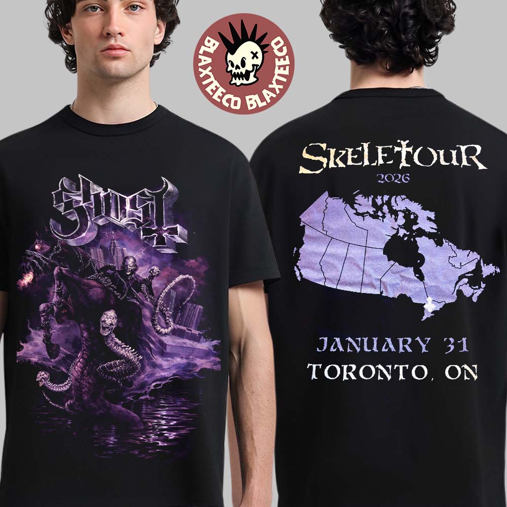 Ghost Skeletour 2026 Toronto Ontario Venue Exclusive Tee At Scotiabank Arena On January 31 2026 T-Shirt is an essential piece of tour merchandise for dedicated Ghost fans and heavy metal collectors. Created exclusively for the January 31, 2026 performance at Scotiabank Arena, this shirt showcases striking dark artwork that perfectly embodies Ghost’s theatrical and mysterious aesthetic. The front design features haunting skeletal figures emerging from a surreal, purple-toned scene, paired with the iconic Ghost logo for a bold and immersive visual impact. Printed on a high-quality black cotton base, the artwork delivers rich detail and long-lasting color, making it ideal for both concert wear and everyday street style.