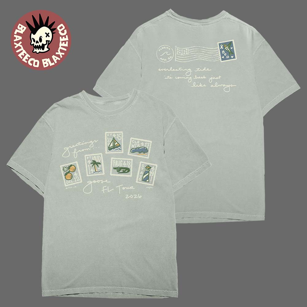 The Goose Florida Tour 2026 Exclusive Benefit T-Shirt is a stylish and collectible piece of merchandise celebrating the Florida run of performances by Goose. Inspired by vintage travel postcards and postage stamps, the design features a creative collage of colorful stamp graphics on the front, accompanied by the handwritten-style message “Greetings from Goose FL Tour 2026.” Each illustrated stamp reflects Florida-themed imagery—such as palm trees, sailboats, sunshine, and coastal landscapes—capturing the laid-back atmosphere and adventurous spirit of the band’s tour across the Sunshine State.