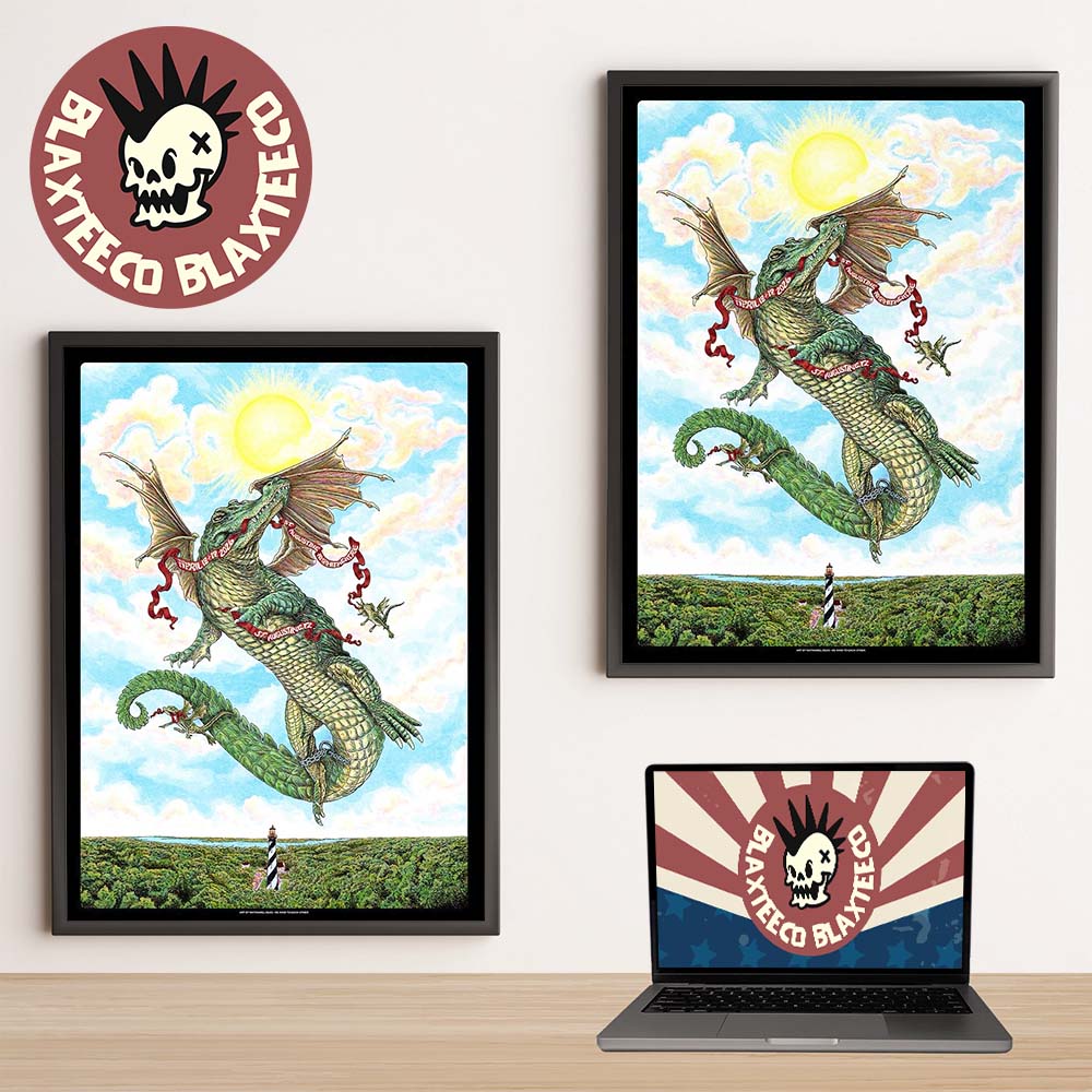 Capture the magic of live music and artistic storytelling with this Goose St Augustine Florida 2026 Venue Poster Run Shows At St Augustine Amphitheatre On April 18 And 19 2026 Alligator Chain Yer Dragon Art Poster Canvas. Inspired by the band’s unforgettable two-night run at the St. Augustine Amphitheatre on April 18 and 19, 2026, this stunning artwork features the iconic “Alligator Chain Yer Dragon” design. The detailed illustration showcases a majestic winged alligator soaring through a bright sky, wrapped in chains with surreal elements that reflect Goose’s creative and improvisational spirit. Set against a scenic Florida landscape with a lighthouse below, this poster perfectly blends fantasy, nature, and music culture into one captivating visual.