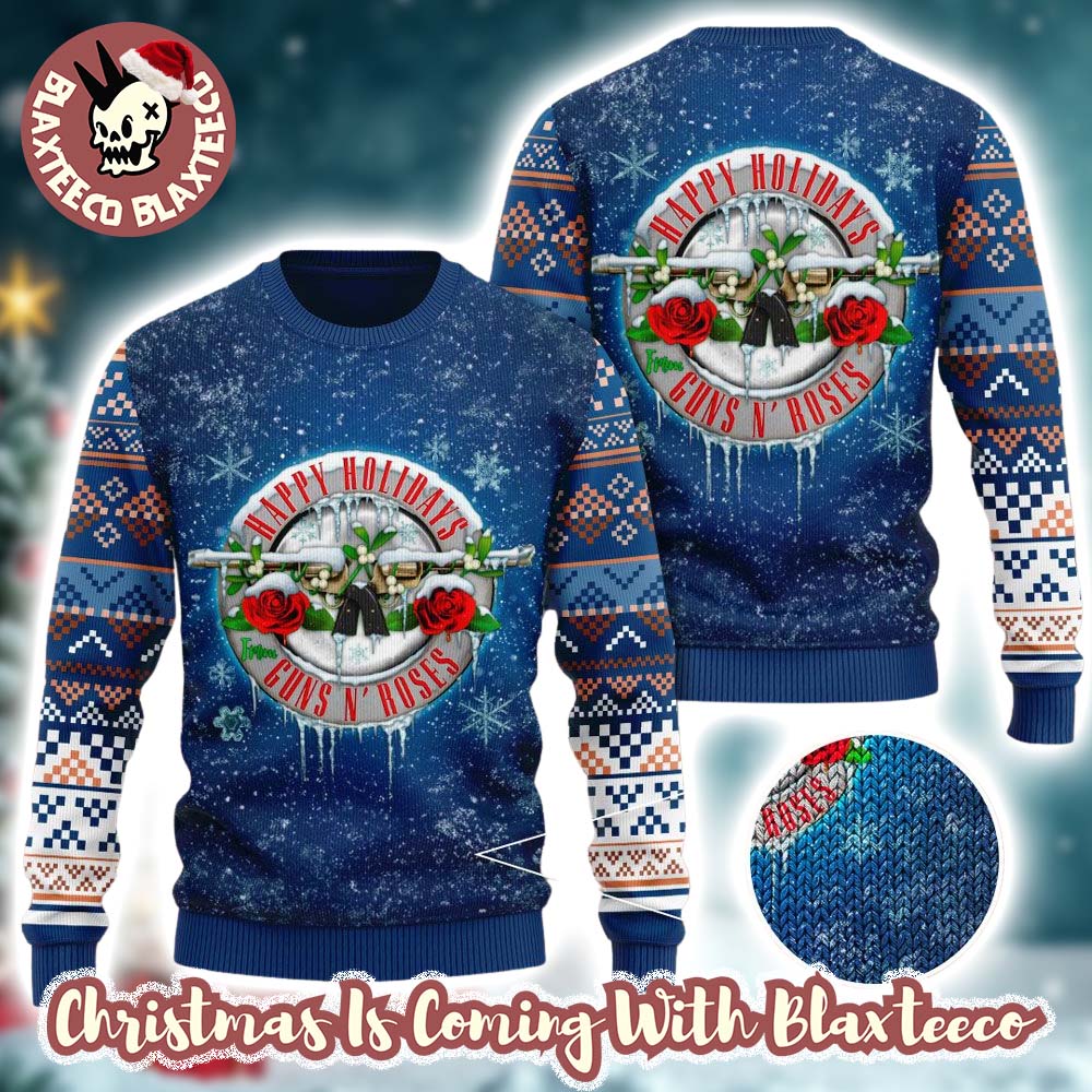 Blaxteeco: About Guns N Roses Happy Holidays Snowy Knitted Blue 2025 Ugly Christmas Sweater: