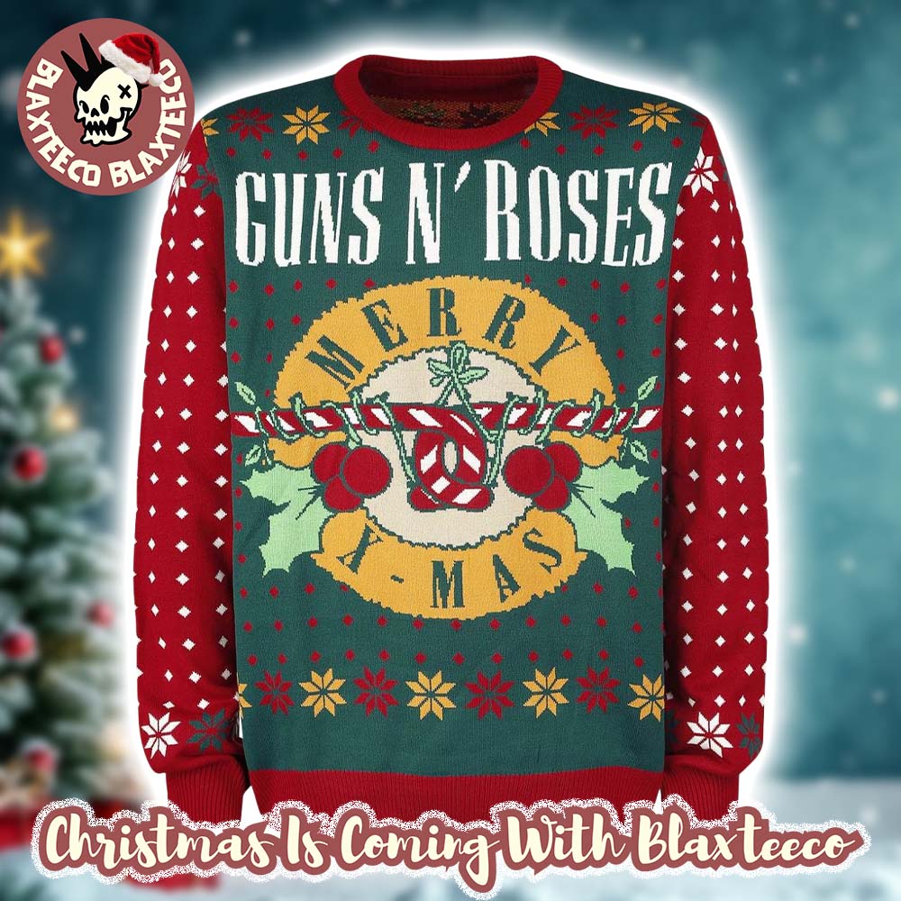 Blaxteeco: About Guns N Roses Merry Xmas Guns Candy Crane Logo Holiday Theme Red And Green Knitted Ugly Christmas Sweater: