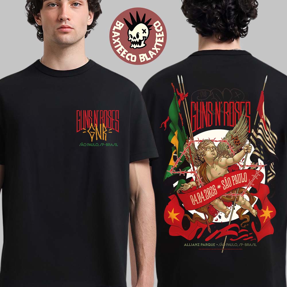 Rock your style with the iconic Guns N Roses Monsters Of Rock 2026 Venue Merch Tee In Sao Paulo Brazil At Allianz Parque On April 4 2026 T-Shirt. This bold design features a clean front logo with “Guns N’ Roses” and “São Paulo, SP – Brazil,” while the back explodes with detailed artwork from the official event poster. A striking cherub figure wrapped in barbed wire, surrounded by vibrant flags and intense red tones, captures the raw energy and rebellious spirit of one of the greatest rock bands of all time. It’s a perfect blend of classic rock attitude and collectible concert merch.