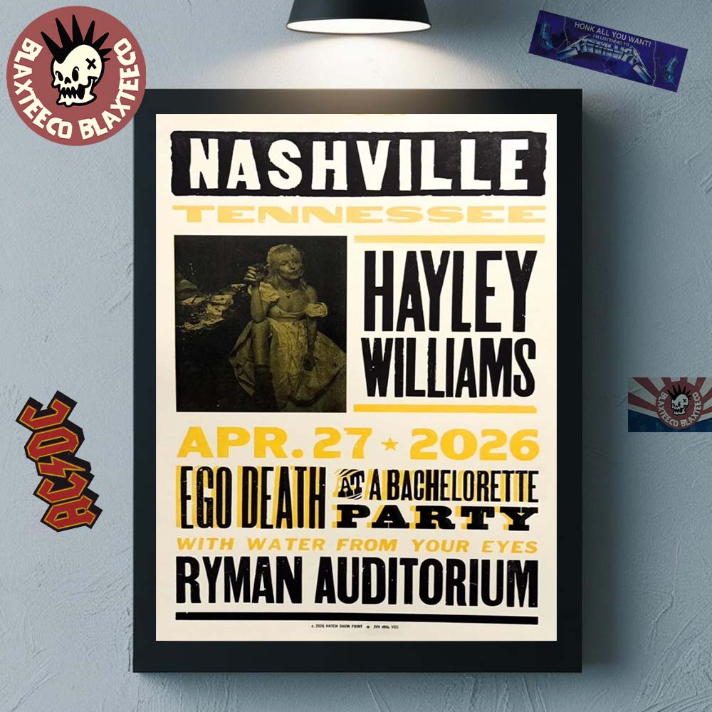 The Halley Williams Nashville Tennessee 2026 Night 2 Venue Poster At Ryman Auditorium On April 27 2026 Good Dye Young Tour Poster Canvas is a bold and stylish collectible that captures the essence of her Good Dye Young tour. Created for the April 27, 2026 performance at the iconic Ryman Auditorium, this poster features a striking typographic layout with a vintage-inspired aesthetic. The design blends black, white, and vibrant yellow tones, highlighting key details like “Nashville Tennessee,” “Hayley Williams,” and the evocative “Ego Death at a Bachelorette Party” theme. The inclusion of a nostalgic, artistic figure adds depth and personality, reflecting Hayley’s unique creative vision and emotional storytelling.