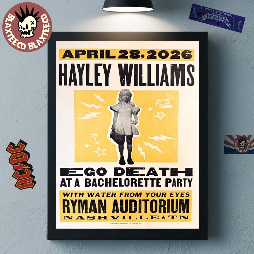 The Halley Williams Nashville Tennessee 2026 Night 3 Venue Poster At Ryman Auditorium On April 28 2026 Good Dye Young Tour Poster Canvas is a bold and collectible piece of tour memorabilia that perfectly captures the energy of her Good Dye Young era. Designed for the unforgettable April 28, 2026 performance at the legendary Ryman Auditorium, this poster features a striking vintage-inspired layout with a vibrant yellow backdrop and high-contrast typography. The central artwork showcases a nostalgic figure surrounded by playful graphic elements like lightning bolts and stars, reflecting Hayley Williams’ signature blend of emotional depth and artistic flair. With details such as “Ego Death at a Bachelorette Party” and special guest mention, this poster feels like a raw, expressive snapshot of a unique live music experience.