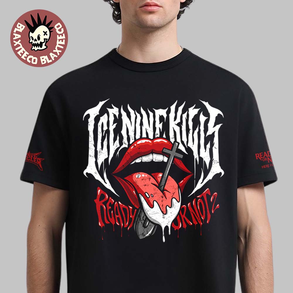 The Ice Nine Kills Grave Diggler X Ready Or Not 2 Here I Come Merch Tongue Shovel T-Shirt is a daring and visually striking piece that perfectly blends horror imagery with the band’s signature theatrical style. The front design features a bold graphic of dripping red lips with a tongue pierced by a shovel, creating a shocking yet artistic centerpiece. Above the graphic, the iconic Ice Nine Kills logo appears in a sharp, gothic font, while the “Ready Or Not 2” text adds a cinematic touch that fans will instantly recognize. The high-contrast red, white, and black color palette enhances the edgy aesthetic, making this t-shirt a standout addition to any alternative wardrobe.