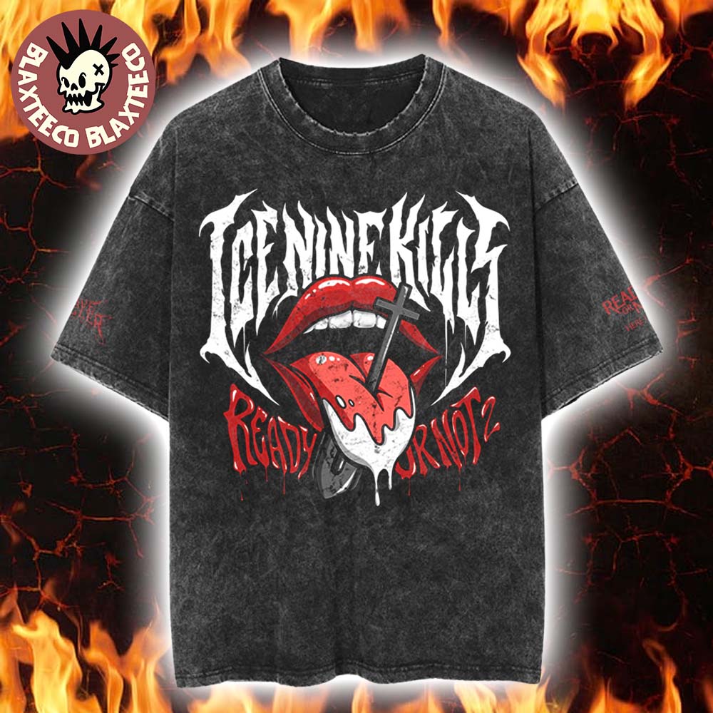 The Ice Nine Kills Grave Diggler X Ready Or Not 2 Here I Come Merch Tongue Shovel Vintage Washed Tee is a bold fusion of horror aesthetics and vintage streetwear style, perfect for fans who want to make a statement. Designed with a unique washed black finish, this t-shirt delivers a distressed, retro look that adds depth and character to the overall design. The front graphic features the iconic Ice Nine Kills logo above a striking image of dripping red lips with a tongue pierced by a shovel, creating a visually intense and unforgettable centerpiece. The “Ready Or Not 2” text below enhances the cinematic horror vibe, making this tee a standout piece in any collection.
