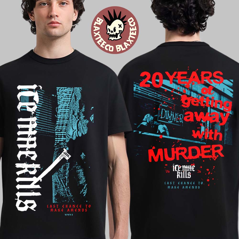 Celebrate two decades of horror-inspired metalcore with the Ice Nine Kills Last Chance to Make Amends 20 Years Of Getting Away With Murder T-Shirt, a bold tribute to the band’s dark and theatrical legacy. This black tee features a striking front design with gritty, distressed typography and eerie blue-toned imagery, perfectly capturing the chilling aesthetic Ice Nine Kills is known for. The back design takes it even further with a dramatic, blood-splattered graphic and the statement “20 Years of Getting Away With Murder,” highlighting the band’s milestone anniversary and their signature fusion of music and horror storytelling.