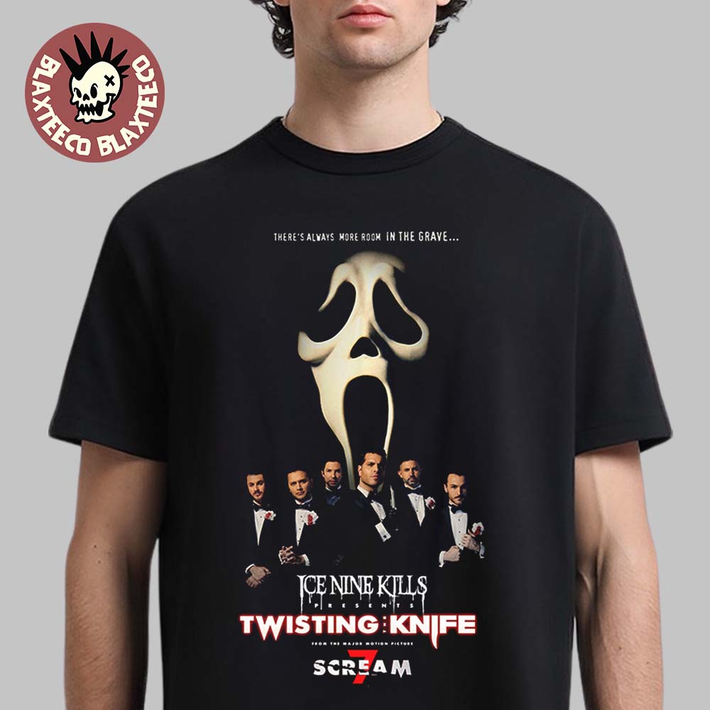 Step into the dark cinematic universe of horror-inspired metal with the Ice Nine Kills Nightmare On The Knife Part 2 Scream 7 Merch Ghost Face Murder Marquee T-Shirt. This striking design blends the theatrical storytelling of Ice Nine Kills with the chilling imagery of classic slasher films. The front graphic features the iconic Ghost Face mask looming above a sharply dressed group, evoking the suspenseful atmosphere of a horror movie poster. The phrase “There’s Always More Room In The Grave…” adds an eerie tone that perfectly matches the band’s signature mix of heavy music and horror aesthetics. Beneath the artwork, the bold text “Ice Nine Kills Presents Twisting Knife – Scream 7” reinforces the cinematic theme, making the shirt feel like a promotional piece from a chilling film premiere.