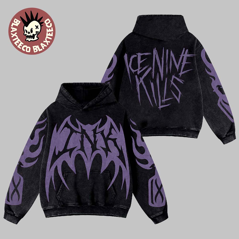 Turn up the chaos in true INK fashion with the Ice Nine Kills The Laugh Track Molotov All Over Print Retro Washed Hoodie — a bold statement piece that screams horrorcore attitude. Designed with a vintage-inspired mineral wash, this hoodie delivers a perfectly worn-in look while featuring striking all-over purple graphics that channel pure metal energy. The front showcases a massive bat-like flame emblem, symbolizing the band’s dark theatrical spirit, while the back explodes with the iconic ICE NINE KILLS logo in razor-sharp typography.