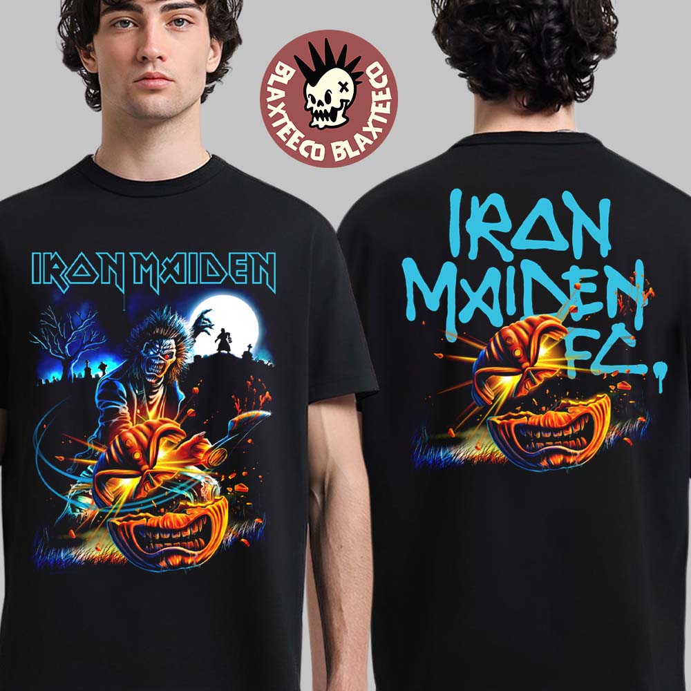 Celebrate the spooky season with a heavy metal twist in the Iron Maiden Eddie Pumpkin Slasher FC Halloween 2025 Two Sided T-Shirt. Featuring the iconic Eddie in a chilling Halloween scene, this shirt captures the band’s dark and electrifying aesthetic. On the front, Eddie is shown carving a fiery jack-o’-lantern under a full moon, surrounded by eerie silhouettes and glowing flames—a nod to Iron Maiden’s classic horror-inspired imagery. The design bursts with vivid blues, oranges, and neon tones, creating a striking visual that stands out day or night.