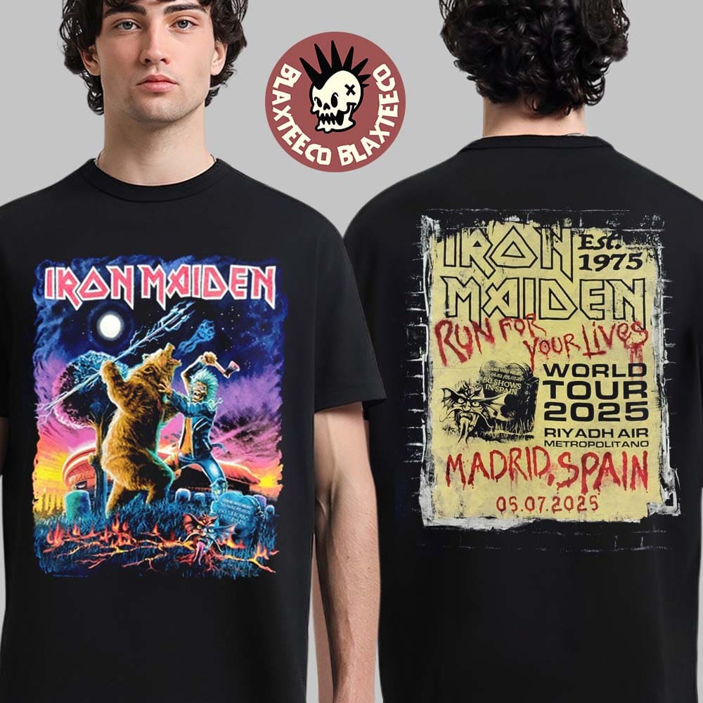 Blaxteeco: About Iron Maiden Madrid Spain Run For Your Lives World Tour 2025 Exclusive Event Tee At Riyadh Air Metropolitano On July 5 2025 Eddie Vs Bear Two Sided T-Shirt: