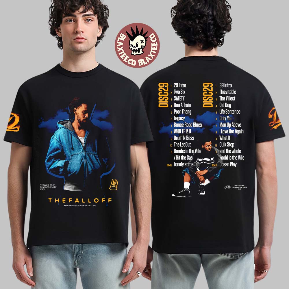 Celebrate one of the most anticipated hip-hop projects with the J Cole The Fall Off Album Cover With Tracklist Designed By Jaee T-Shirt, a must-have piece for true rap fans and streetwear lovers. Inspired by J. Cole and his highly acclaimed album The Fall Off, this two-sided graphic T-shirt features striking album-cover artwork on the front and the full tracklist printed on the back. Designed by Jaee, the visuals capture the introspective mood, lyrical depth, and raw storytelling that define J. Cole’s artistry. The dark, cinematic color palette and clean typography make this shirt both a tribute to the music and a bold fashion statement.