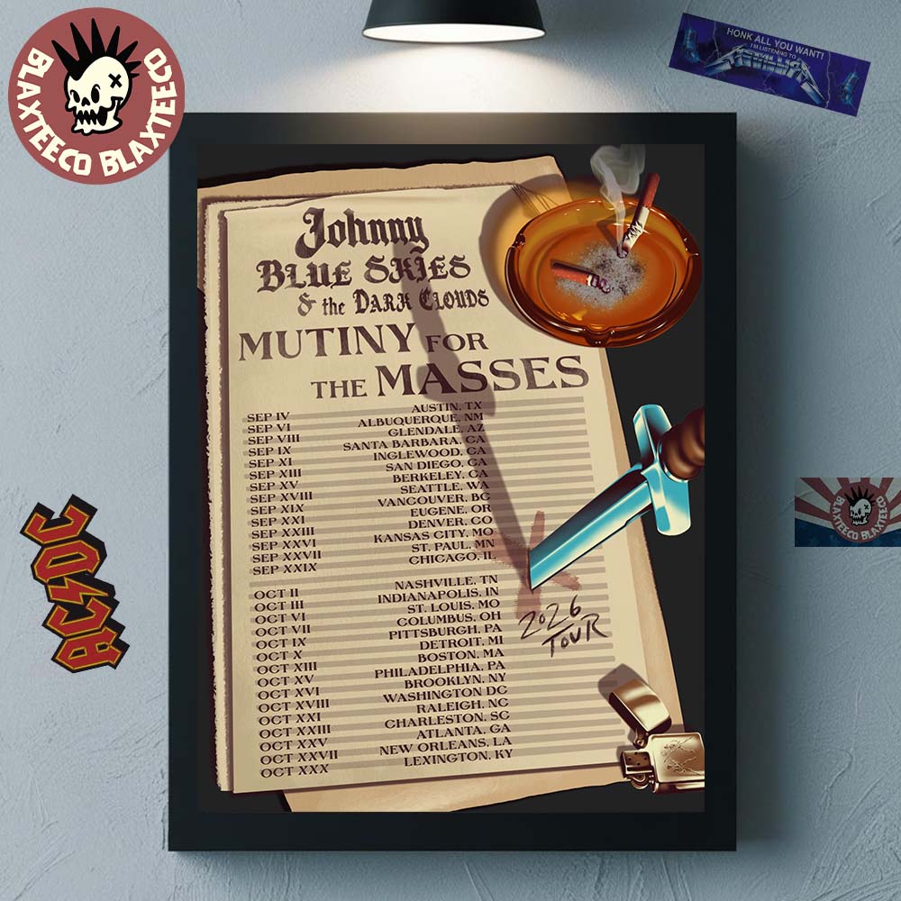 Capture the rebellious spirit of live music with the Johnny Blue Skies And The Dark Clouds Mutiny For The Masses 2026 North America Tour Schedule Dates Poster Canvas, a striking piece that blends storytelling and vintage design. Featuring Johnny Blue Skies and his band, this poster presents the full 2026 tour schedule in a creative, narrative-driven layout. Designed like an aged document, complete with bold typography and gritty details, it evokes a sense of underground movement and raw artistic energy. Elements like the dagger, ashtray, and handwritten notes add a cinematic touch, making the artwork feel like a manifesto rather than just a tour listing.