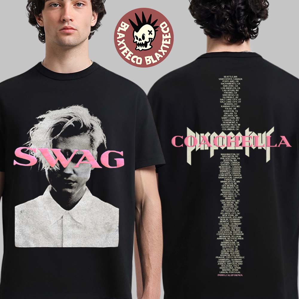 Step into festival-ready style with the Justin Bieber Coachella 2026 Day 2 Merch Purpose Tour X Swag SKYLRK Two Sided T-Shirt—a bold fusion of pop icon energy and streetwear attitude. This black tee makes an instant statement with a striking front graphic featuring a monochrome portrait of Justin Bieber layered with vibrant pink “SWAG” lettering, giving it that edgy, fashion-forward vibe fans love.